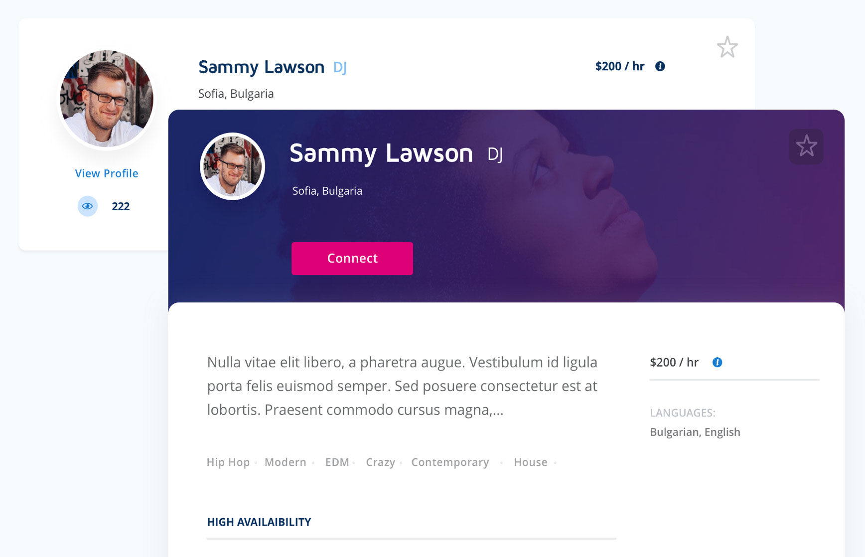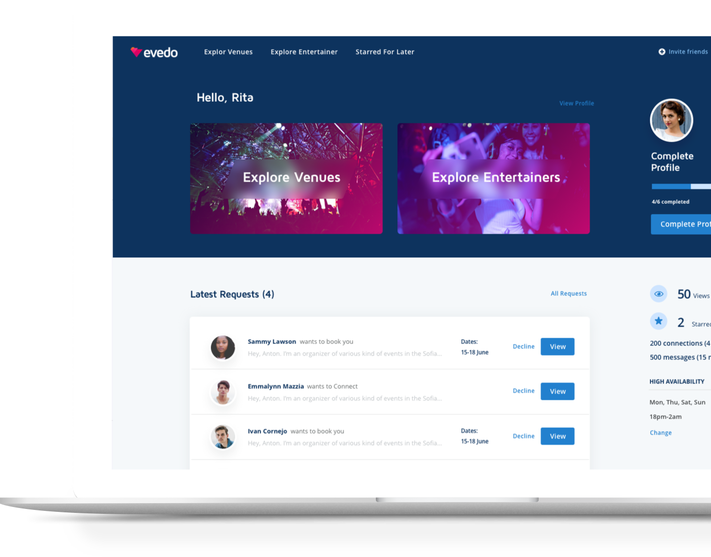 evedo's platform is a place where entertainers can benefit of getting more gigs by being discoverable. Entertainers can be any type of performers - speakers, dj's, singers, dancers, etc.